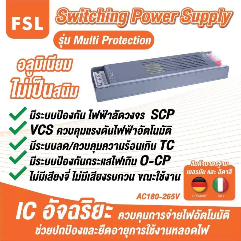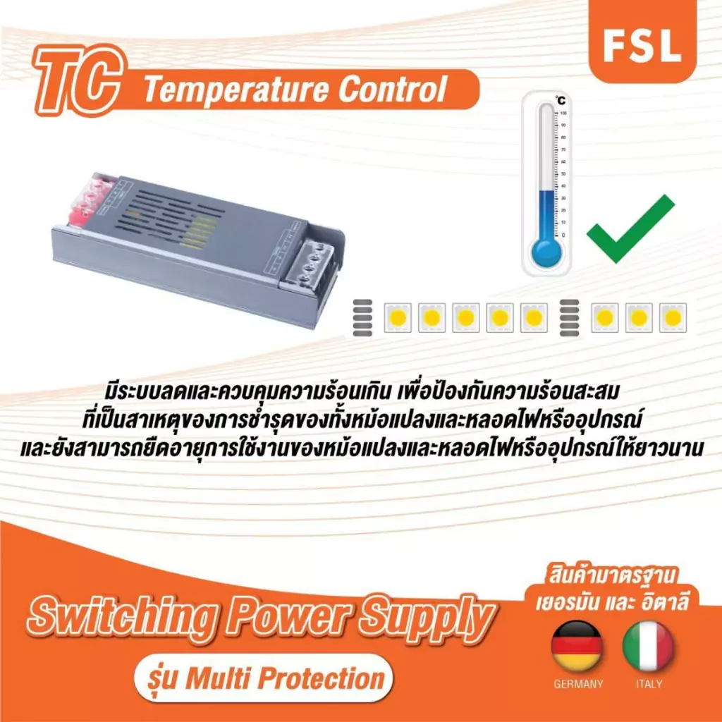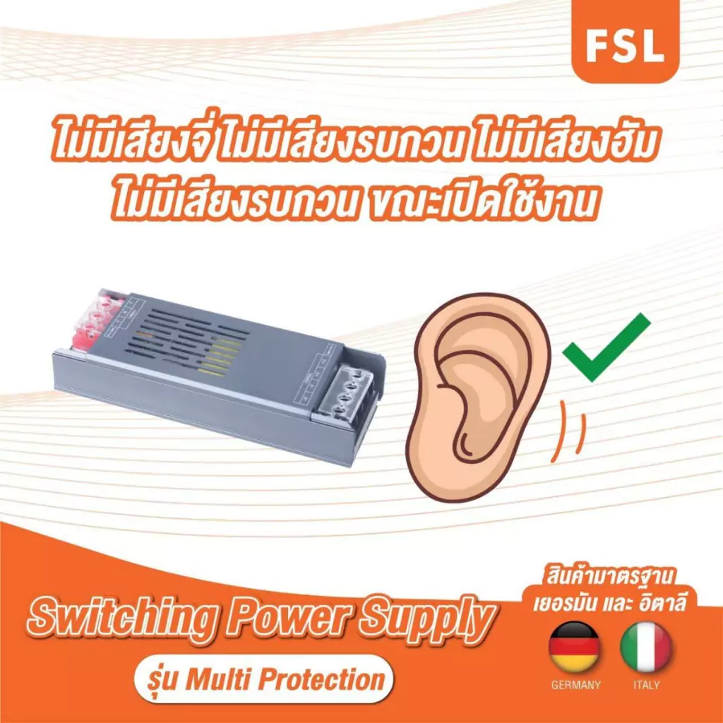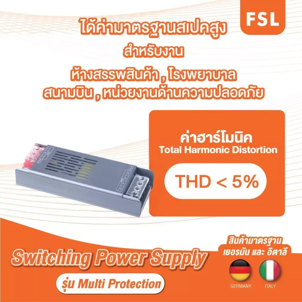 สวิตชิ่งพาวเวอร์ซัปพลาย จาก FSL หม้อแปลงขนาดเล็กที่จ่ายพลังงานไฟฟ้าจากระบบไฟบ้านไปยังอุปกรณ์ต่าง ๆ โดยทำหน้าที่แปลงแรงดันไฟฟ้ากระแสสลับให้เป็นแรงดันไฟฟ้ากระแสไฟตรงเพื่อให้ฟังก์ชันของอุปกรณ์อิเล็กทรอนิกส์ทำงานได้อย่างมีประสิทธิภาพ สะดวกต่อการติดตั้งใช้งานด้วยขนาดที่กะทัดรัด น้ำหนักเบา และมีพัดลมระบายความร้อนในตัว เหมาะสำหรับใช้ร่วมกับหลอดไฟหรือไฟเส้น