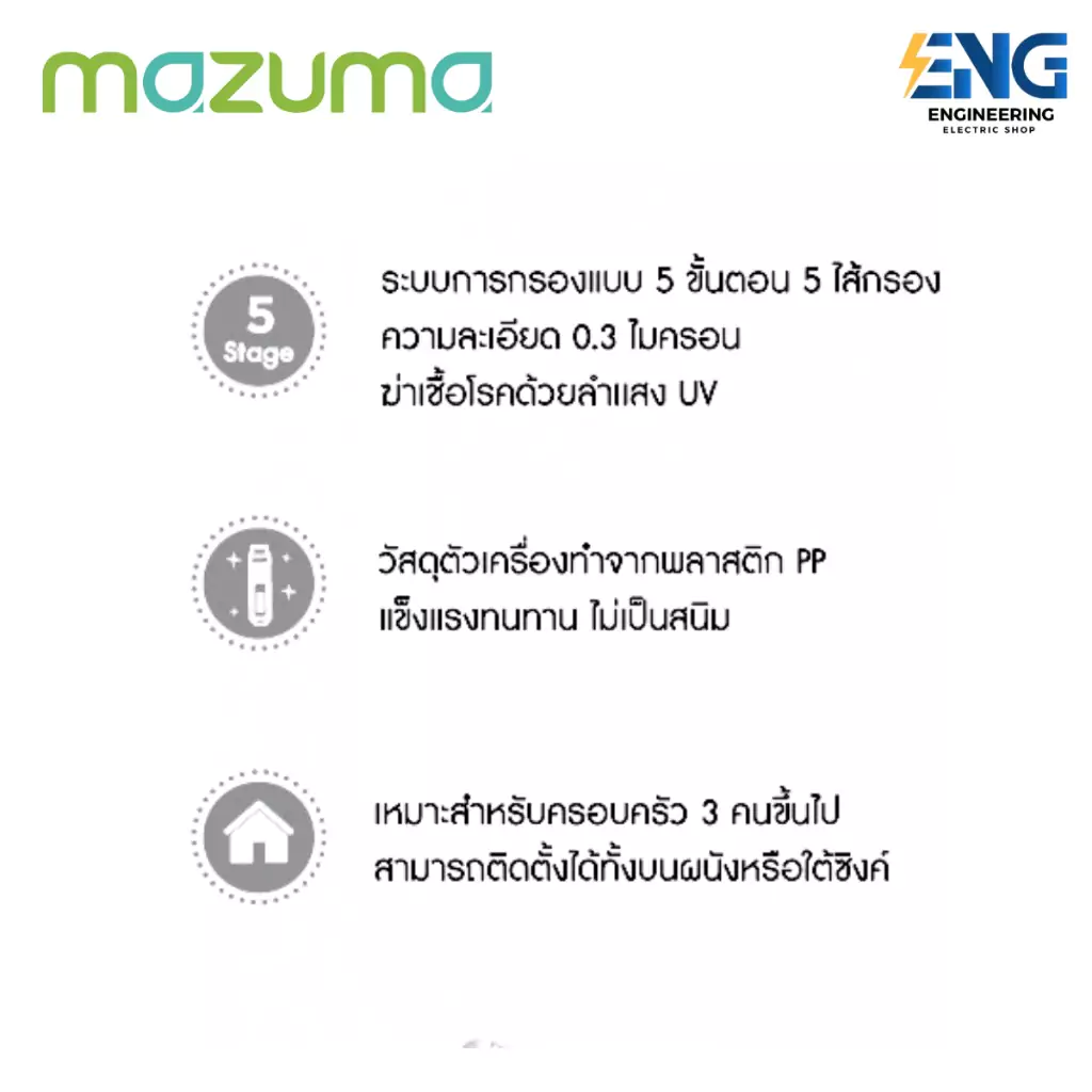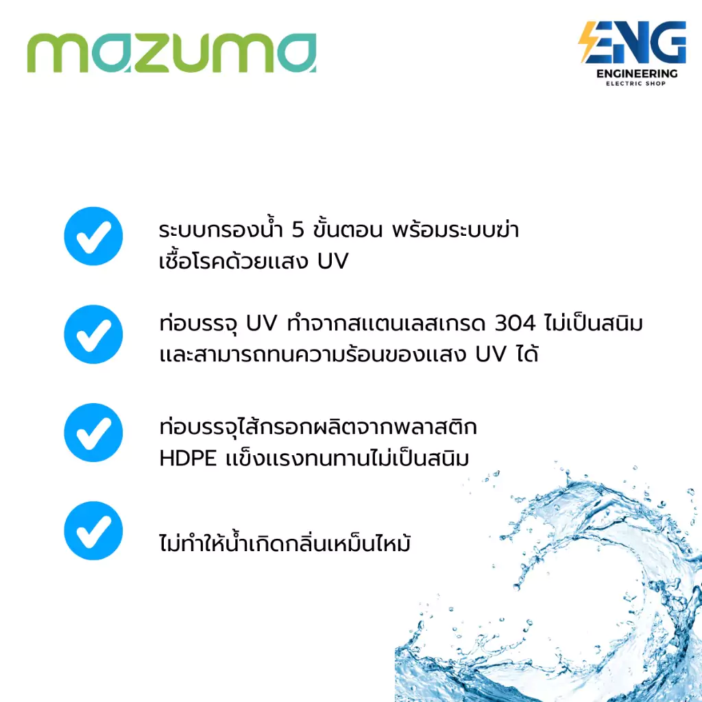 เครื่องกรองน้ำ MAZUMA รุ่น HD-5F-UVS มีระบบกรองน้ำที่ได้มาตรฐาน คุณภาพดี พร้อมระบบฆ่าเชื้อโรคด้วยแสง UV ไม่ทำให้น้ำเกิดกลิ่น เหมาะสำหรับกรองน้ำเพื่อการบริโภค ใช้ได้ในสำหรับครอบครัว 4- 6 คนรายละเอียด