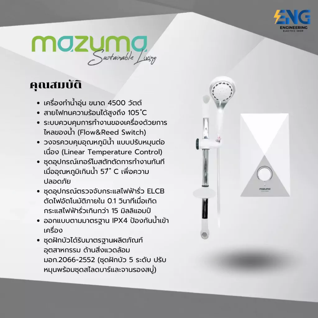 – ชุดฝักบัวได้รับมาตรฐานผลิตภัณฑ์อุตสาหกรรม ด้านสิ่งแวดล้อม มอก.2066-2552 (ชุดฝักบัว 5 ระดับ ปรับหมุนพร้อมชุดสไลดบาร์และจานรองสบู่่)